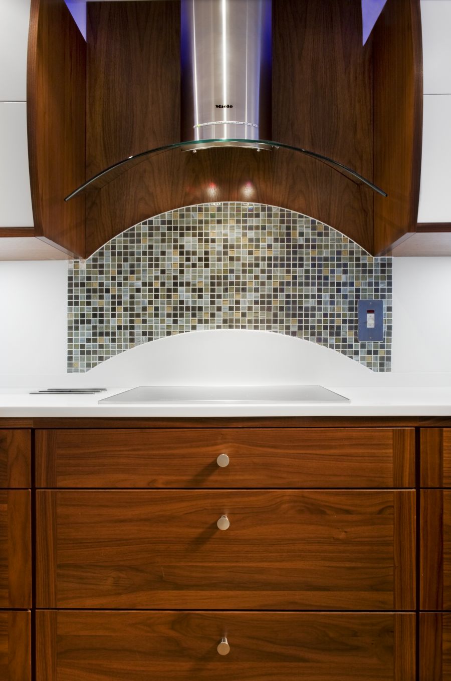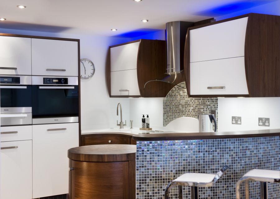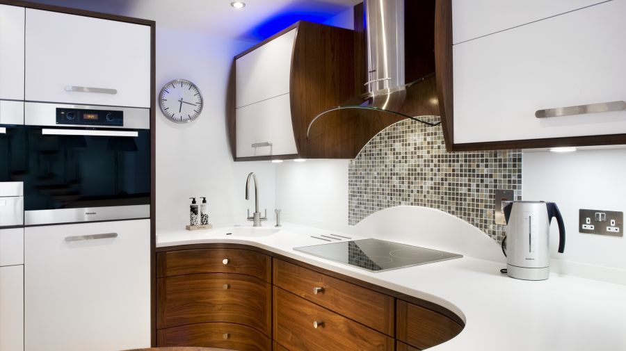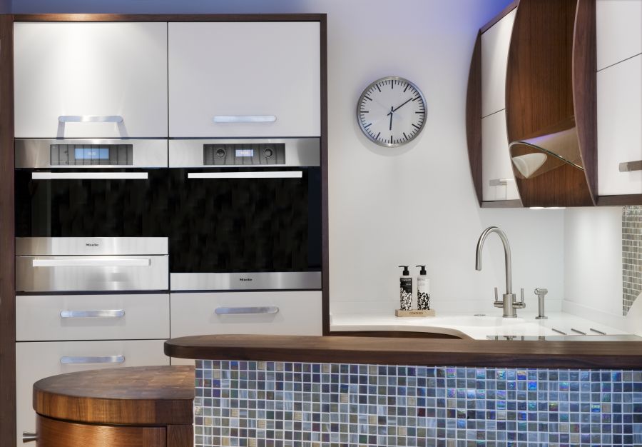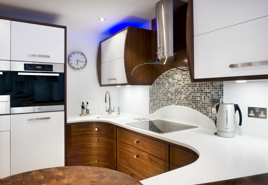 A Stoneham kitchen installation with walnut cupboards and a Corian worktop, incorporating a curved breakfast bar area. Miele appliances including a coffee machine, steam oven and induction hob.