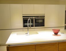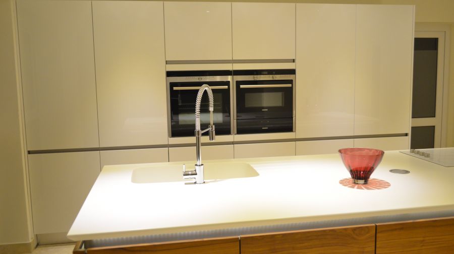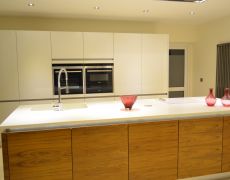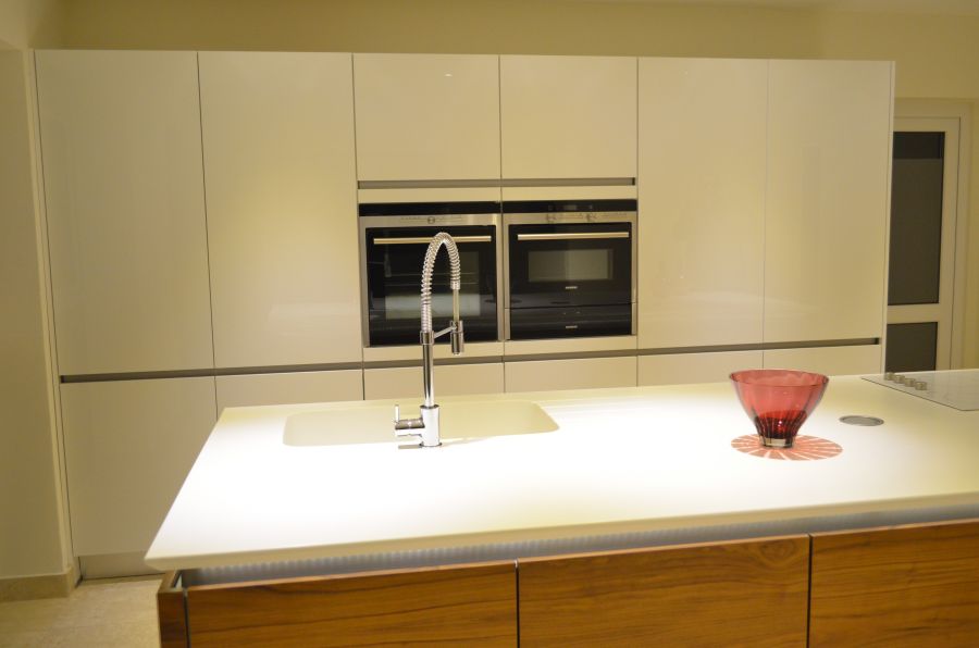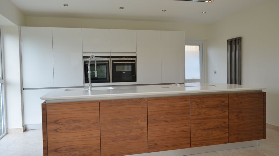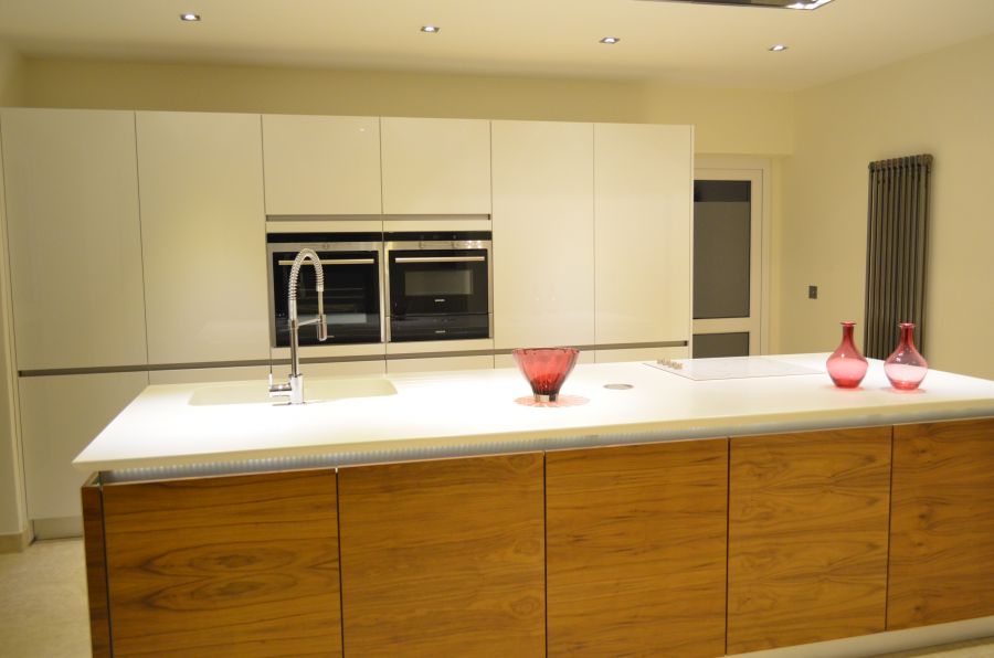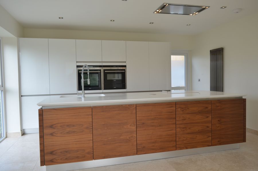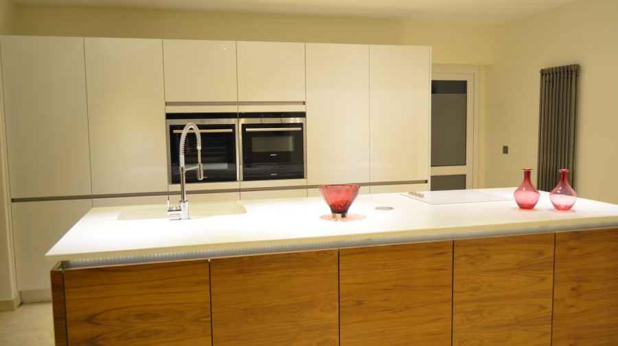 Using a combination of Fusion Linear high gloss white and Natural walnut handless furniture with Siemens appliances and Corian work surfaces. Flooing is a light travertine natural stone.