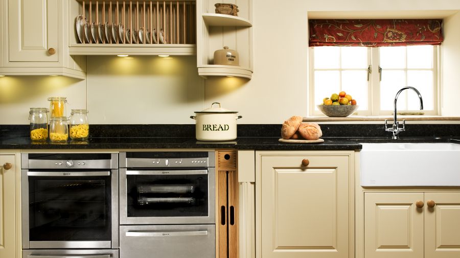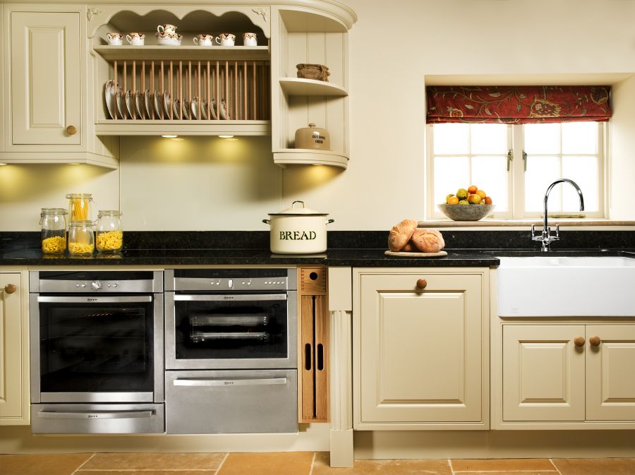 A classic wooden painted bespoke Stoneham kitchen installation with Neff appliances.